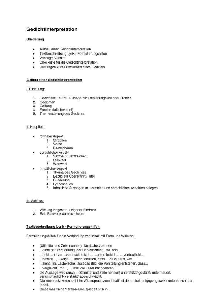 Danach beschreibst du im hauptteil den inhalt, den aufbau und die sprache des gedichts und interpretierst deine bisherigen .